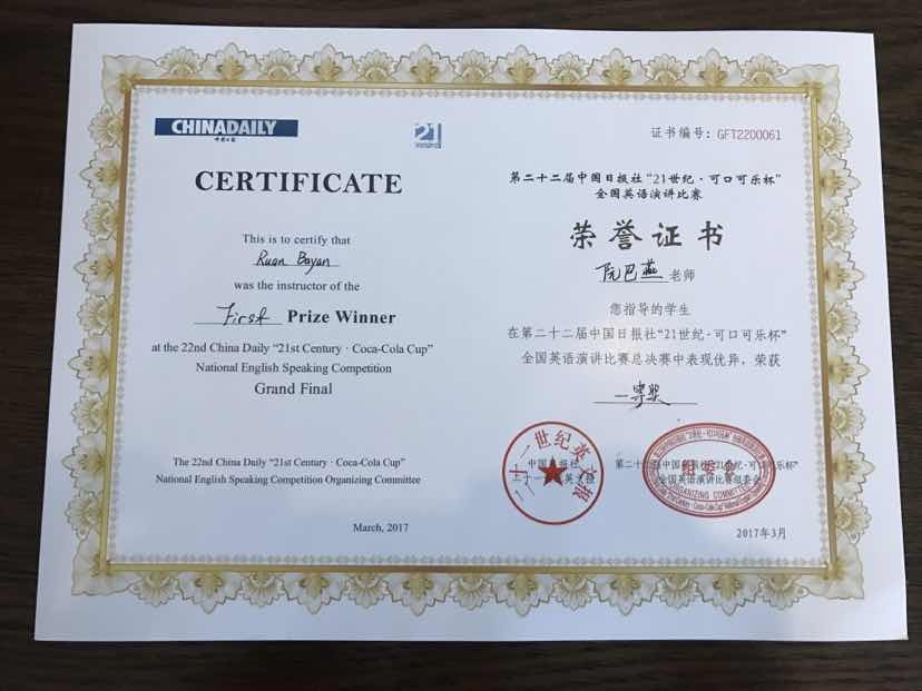 2017年3月24-26日,公司学子mk体育的厉修远同学参加了在南京大学举办的第22届中国日报社“21世纪.可口可乐杯”全国英语演讲比赛,获得全国总决赛(大学组)一等奖的好成绩,指导老师mk体育的阮巴燕老师获得全国指导老师一等奖。