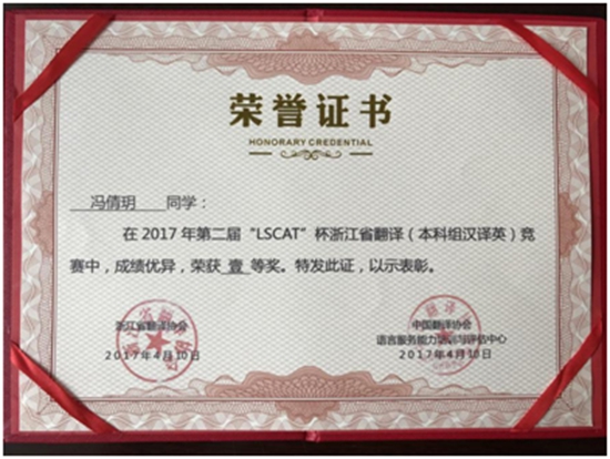 本次大赛面向全省高校员工,分本科组和专科组。本科组的参赛选手来自全省各大本科院校的研究生和本科生,具体分汉译英及英译汉两个组别。由mk体育蒋阳芬老师指导的冯倩玥、周若倩2名同学荣获汉译英一等奖;由孙广平、张腮云老师指导的皇甫含婷、唐浙译同学获得汉译英二等奖;由蒋阳芬、陆莺老师指导的冯倩玥、杨媚、孙芳芳、程江云4名同学获得英译汉二等奖。由陈俊林、孙永田、李飒、阮巴燕等老师指导的王薇、王方家等8名同学获得汉译英三等奖,黄跃妮、印雪等15名同学获得英译汉三等奖。俞银、郑莎鹿等38名同学荣获汉译英、英译汉优胜奖。