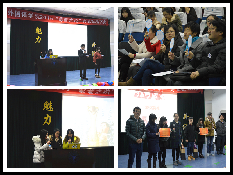 紧接着决赛开始。第一组为我们带来的是《白雪公主和七个小矮人》中的经典片段,选手们声情并茂将白雪公主的善良,小矮人的热情还有王后的邪恶,都在言语中展现的淋漓尽致,赢得阵阵喝彩,守谷老师更是打出了10分的高分。而之后的《冰河世纪》也是分外出彩,同样也给观众留下了深刻的印象。第三组的《超人总动员》,环环相扣的画面加上精彩的配音,给人以身临其境的感觉,瞬间又点燃了现场的气氛。接下来的《冰川世纪4》也是精彩纷呈,热闹非凡,令人更加期待后面的表演。前半场的压轴《日常》,这部在日本家喻户晓的动漫也被参赛者搬上荧屏,同学们的表现更是不俗,发音地道娴熟,如同专业的配音演员,不出意外地取得了很棒的成绩。