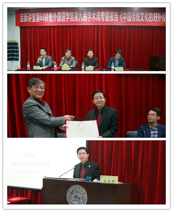 讲座伊始,郭英剑教授介绍了在目前全球化、网络化的大背景下,中国传统文化的对外传播的现状。通过两张图:陈光标在美国救济流浪汉、国外开设的孔子公司,直观表现了在全球化时代中西方文化不断碰撞和交融的现象,深入探讨了目前传播中国文化过程中的困境与挑战。
