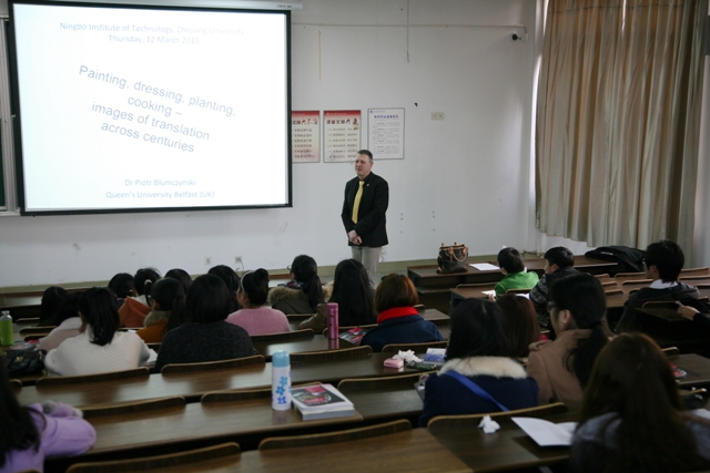 3月12日下午,英国贝尔法斯特女王大学翻译学科负责人Piotr Blumczyski博士应邀为mk体育的员工做题为Painting, dressing, planting and cooking—images of translation across centuries的专题讲座。公司大三全体员工参加了讲座,讲座由英语专业负责人张振梅副教授主持。
