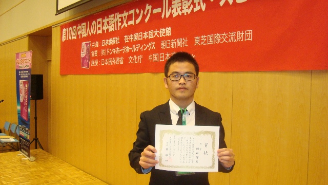 “中国人日语作文大赛”由日本侨报社日中交流所主办,从2005年开始已连续举办九届,每次都收到中国100多所大学的约三千篇应征稿。本次第十届大赛共收到来自全国24个省市区、196所院校的4133篇投稿,共有61名参赛选手获一二三等奖(其中最优秀奖1名、一等奖5名、二等奖15名,三等奖40名),95名获佳作奖。与陈林杰同学一同获奖的还有北京外国语大学、同济大学、中南大学、大连大学等知名院校的选手。 |