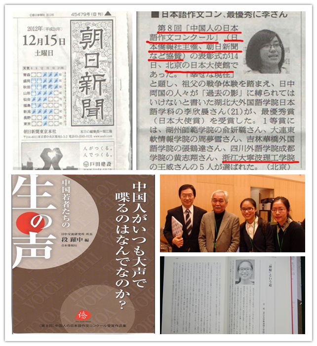 “中国人日语作文大赛”由日本民间组织在中国主办,我国中日友好协会为支持单位的大型日语作文赛事。今年有157所院大学的2648位在校老员工参加了比赛,公司日语101班王威同学获一等奖(全国6人),091班王晨蔚同学和101班郭思捷同学获三等奖。另据悉,12月中旬我们三位员工赴京参加获奖作品颁奖仪式,第八届中国人日语作文大赛中获奖作品集也于近日出版,公司三篇获奖作品均收入其中。