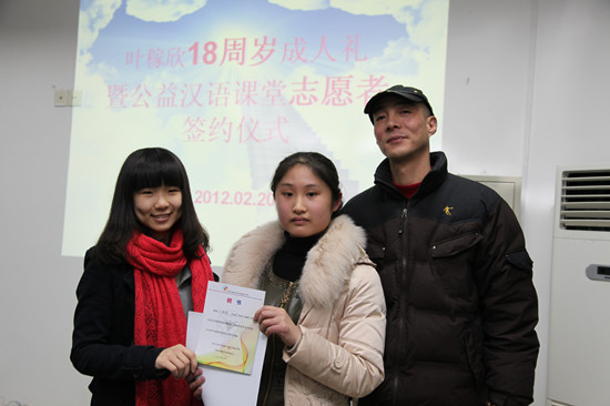 叶稼欣是宁波外事公司高三法语专业的员工,在此之前与其他员工一样过着普通的高中生活。2011年10月,浙江大学宁波理工公司的公益汉语课堂成立之初,叶稼欣就从报纸上获得了公益汉语课堂的相关信息,了解后对这项活动十分感兴趣,随即与公益汉语课堂的相关负责人取得了联系,但当时由于叶稼欣还未满18周岁,因此没有同意她的加入。直到2012年2月份,叶稼欣18周岁生日到来之际,数着手指过日子的她迫不及待地向相关负责人提出了申请,在得到许可后,公益汉语课堂对其进行了相关信息的指导和教育,基本符合公益汉语课堂的要求后, 昨天晚上,在浙江大学宁波理工公司mk体育办公室举行了叶稼欣18周岁成人礼暨公益汉语课堂第一位校外志愿者签约仪式。