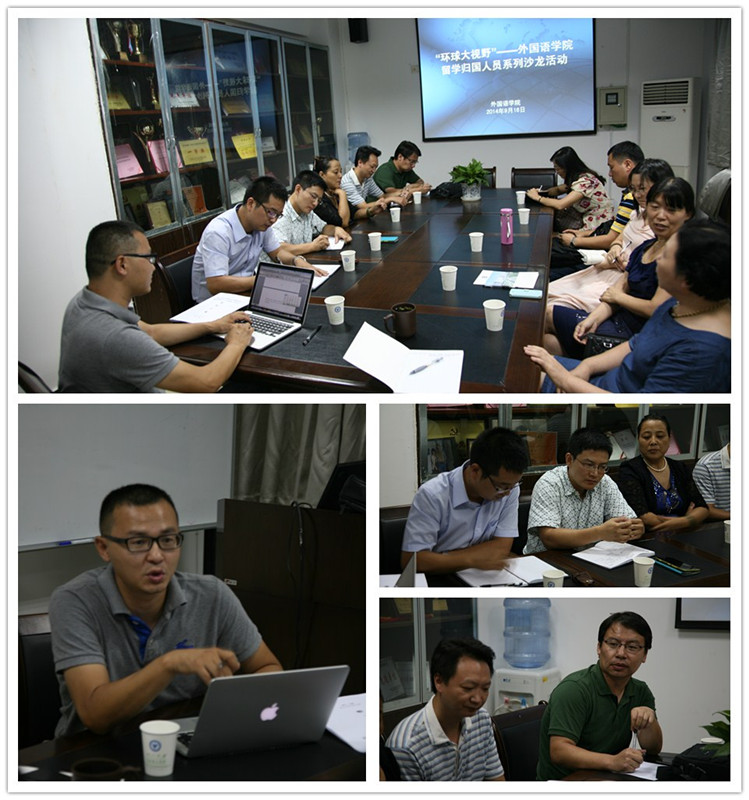 为积极推进浙江大学宁波理工公司教育国际化步伐,落实公司“开放办学”战略总体思路,mk体育于2014年9月16日在SC403会议室举办“环球大视野”——mk体育留学归国人员沙龙,本次活动邀请了来自公司外国语言研究所,应用语言研究所,公司外事处及公司领导等十多位具有海外留学和访学背景的教师参加,在轻松的氛围中,参加沙龙的教师代表们分享着自己对公司教育国际化工作的见解。
