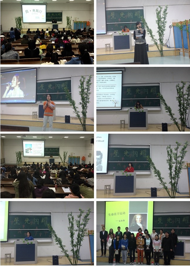 刘杰老师的一句“就让我们在日益浮躁的时空中,把心沉静下来去寻找久违的文学热情,诗意地栖居。”正式拉开了活动的序幕。随着商英131班徐倩颖同学的娓娓叙述,那个遥远而清晰的“简·奥斯汀”渐渐浮现在同学们的脑海中,爱情,男人,女人这些永恒的话题在“奥斯汀”的作品里扑面而来,让人感受着作家对于生活的热爱,对于美好的向往。而接下来的日语131班的吴冬莲等同学则给了大家一个小小的惊喜:一个日语版的《生死判官》的配音,参赛选手将周星驰在里面“舌战群雄”的环节用日语进行了淋漓尽致地还原,博得了现场阵阵喝彩。选手们准确地翻译,流畅的口语,让人充分感受到了那种语言的狂飙之美。而选手们对于周星驰的全方位解读,更让人懂得成功不仅需要努力,有时更要坚持。