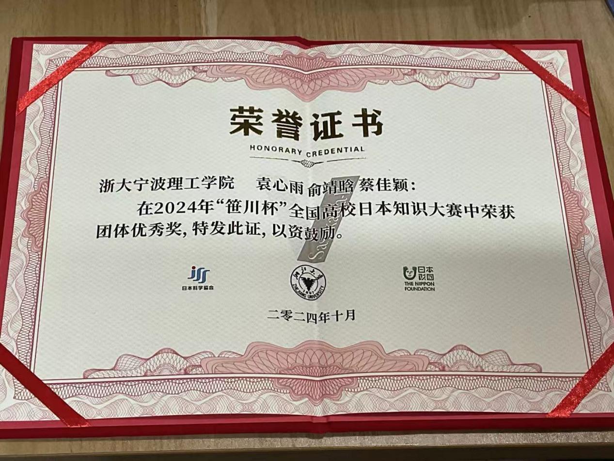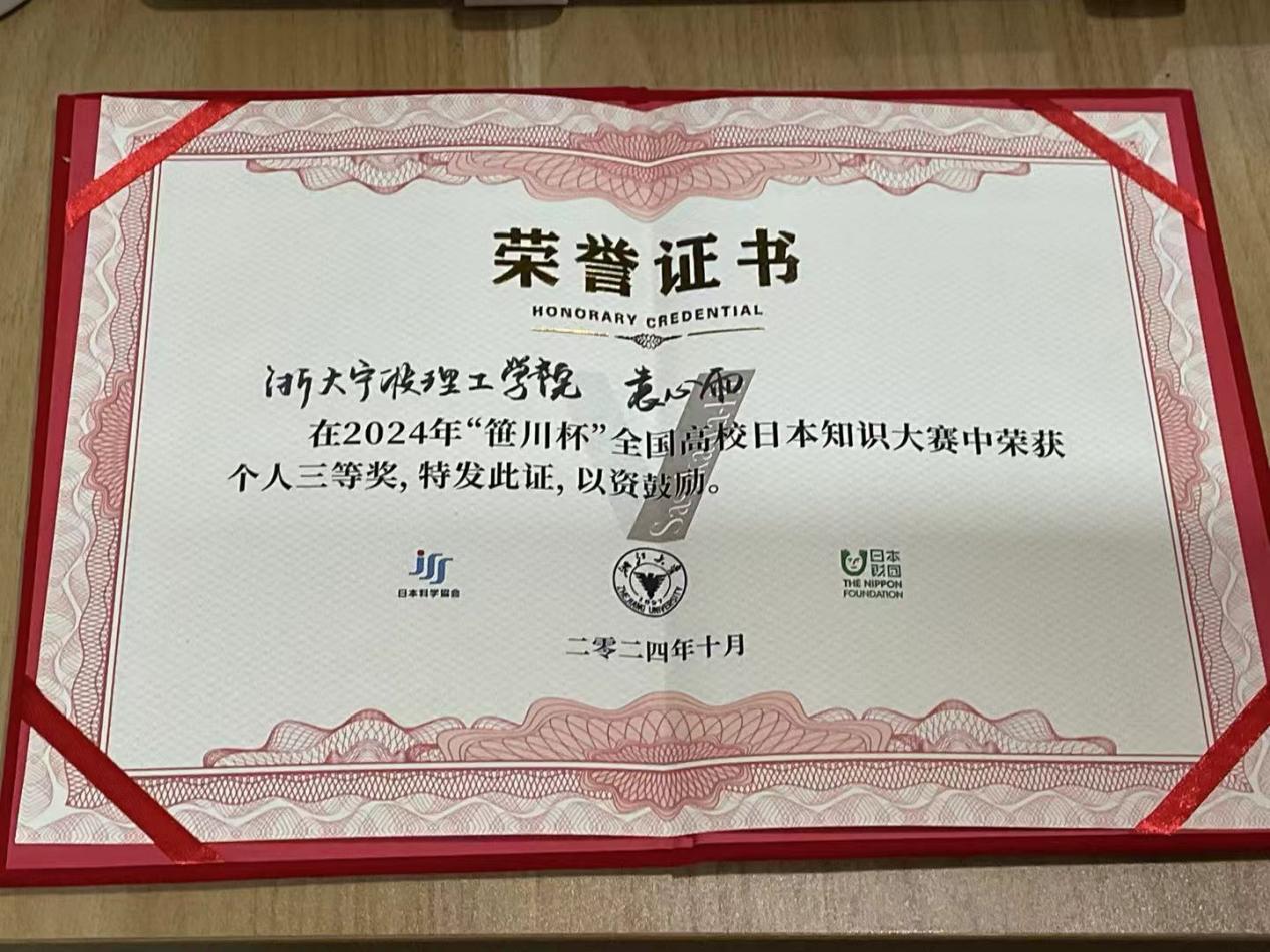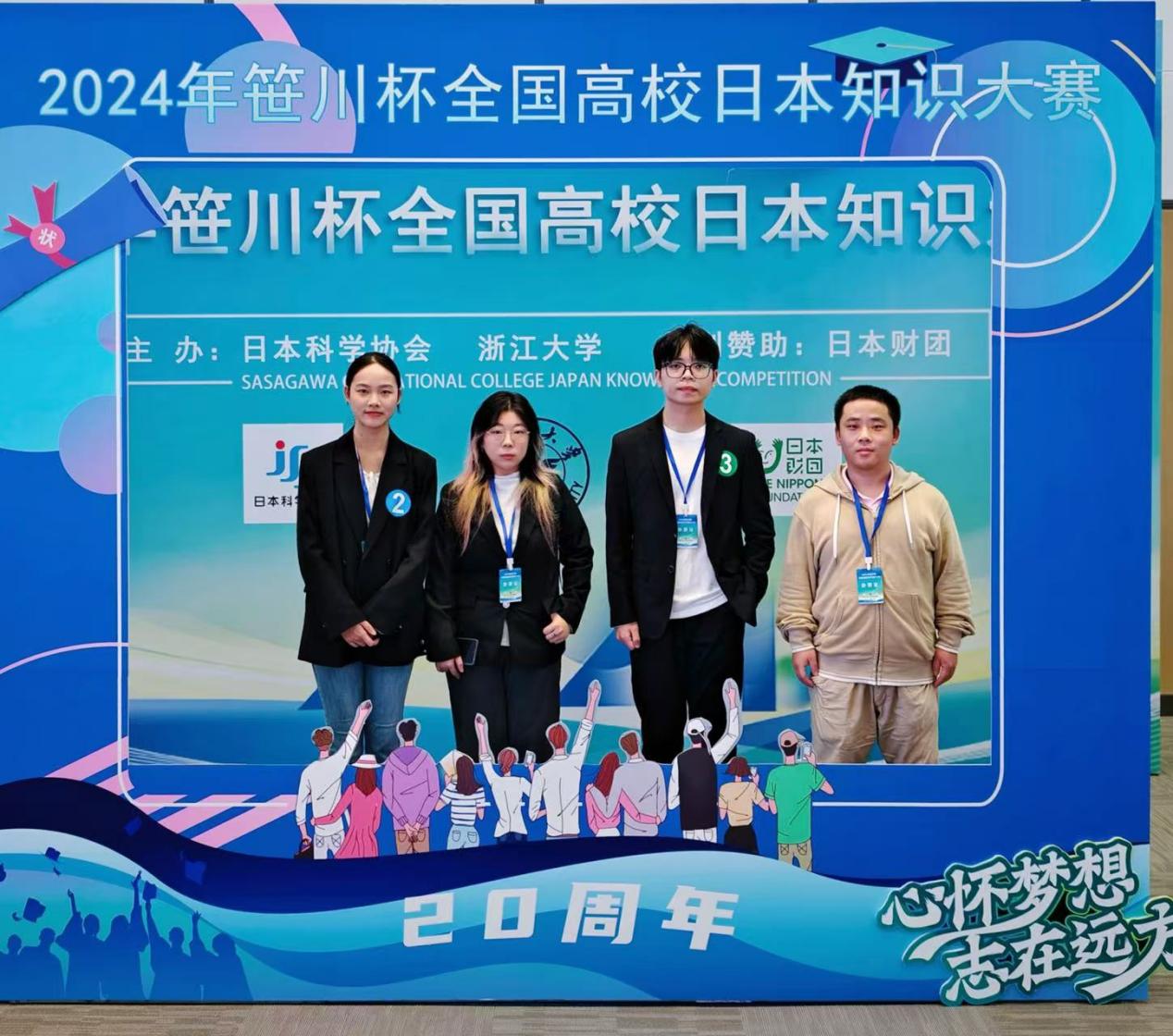 10月27日,2024年“笹川杯”全国高校日本知识大赛在浙江大学落下帷幕,来自北京大学、南京大学、中国人民大学、北京外国语大学、上海外国语大学、天津外国语大学等全国97所高校的400余名师生齐聚一堂,经过两天的精彩比拼决出了团体及个人赛的奖项。在指导教师李先瑞教授的悉心指导和员工们的不懈努力下,公司mk体育日语专业2021级袁心雨同学脱颖而出,荣获个人三等奖。此外,袁心雨同学、俞靖晗同学、蔡佳颖同学荣获团体优秀奖,李先瑞老师,余祎延老师荣获杰出指导教师奖。