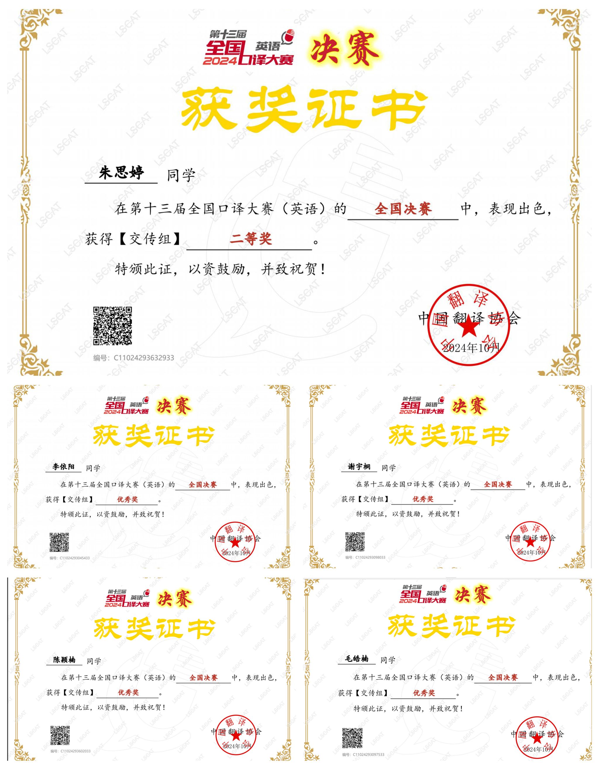 本届全国口译大赛于今年3月启动,采用省级初赛、省级复赛、全国决赛三级赛制。公司选派的14名选手中共有12位晋级省级复赛,其中陈颖楠同学获得省级复赛一等奖,朱思婷、毛皓楠、谢宇桐和李依阳等四位同学获得二等奖,张忆天、张淑婷、柳雨欣、李缘缘、章若煊、郑涵旭、邱子轩等七位同学获得三等奖。获得复赛一、二等奖的五位优秀选手顺利晋级全国决赛,在公司老师的指导下,积极备战,最终朱思婷同学荣获全国二等奖,全国排名第169名,创历史最佳成绩,李依阳、谢宇桐、毛皓楠、陈颖楠等四位同学荣获全国优秀奖。