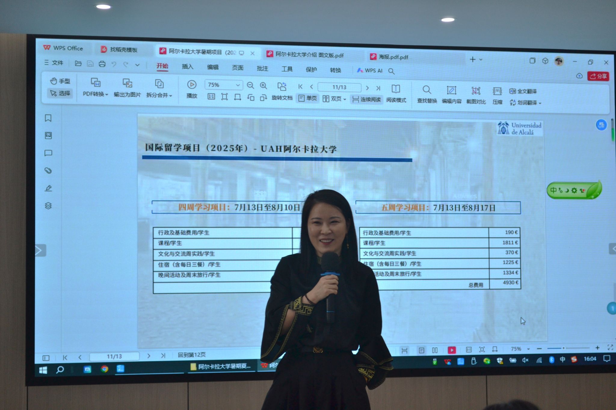 为进一步拓宽海外交流访学渠道,给员工创造更多开拓国际视野、体验多元文化的优质国际交流机会,11月5日下午3点30分,mk体育于SC405举行了西班牙阿尔卡拉大学2025年暑期微留学项目宣讲会。本次活动邀请到项目负责人——西班牙宁波商会会长、西班牙环球教育公司总经理、萨拉曼卡大学与剑桥大学联合培养博士陈荣荣到现场做项目宣讲,mk体育经理助理林晶晶、外事秘书赵远、公司新引进教师张秒秒和百余位校内员工参加了活动。