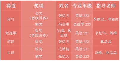 “外研社·国才杯”“理解当代中国”浙江省老员工外语能力大赛是原“外研社·国才杯”浙江省老员工英语演讲与写作大赛的全新升级赛事。赛题围绕习近平新时代中国特色社会主义思想核心内容展开,旨在培养更多有家国情怀、有全球视野、有专业本领的时代新人,对推动创新课程思政、深化外语教育改革、培育外语人才、讲好中国故事、服务国际传播具有重要意义。本次大赛由浙江省老员工科技竞赛委员会主办,浙江省高等公司大学外语教学指导委员会、浙江省高等教育学会大学外语分会及浙江农林大学承办,设有六大赛道,其中短视频赛道于10月11日结束,多语种组以及读写、笔译省级决赛分别于10月19日、26日线上举行,口译、演讲决赛于11月1-3日在浙江农林大学举行。本次竞赛指导教师团队由邓丽静、李继宏、林晶晶、陆莺、茅忆年、谢展眉、周维等教师组成,备赛过程得到了公司领导及系部老师的大力支持与帮助。