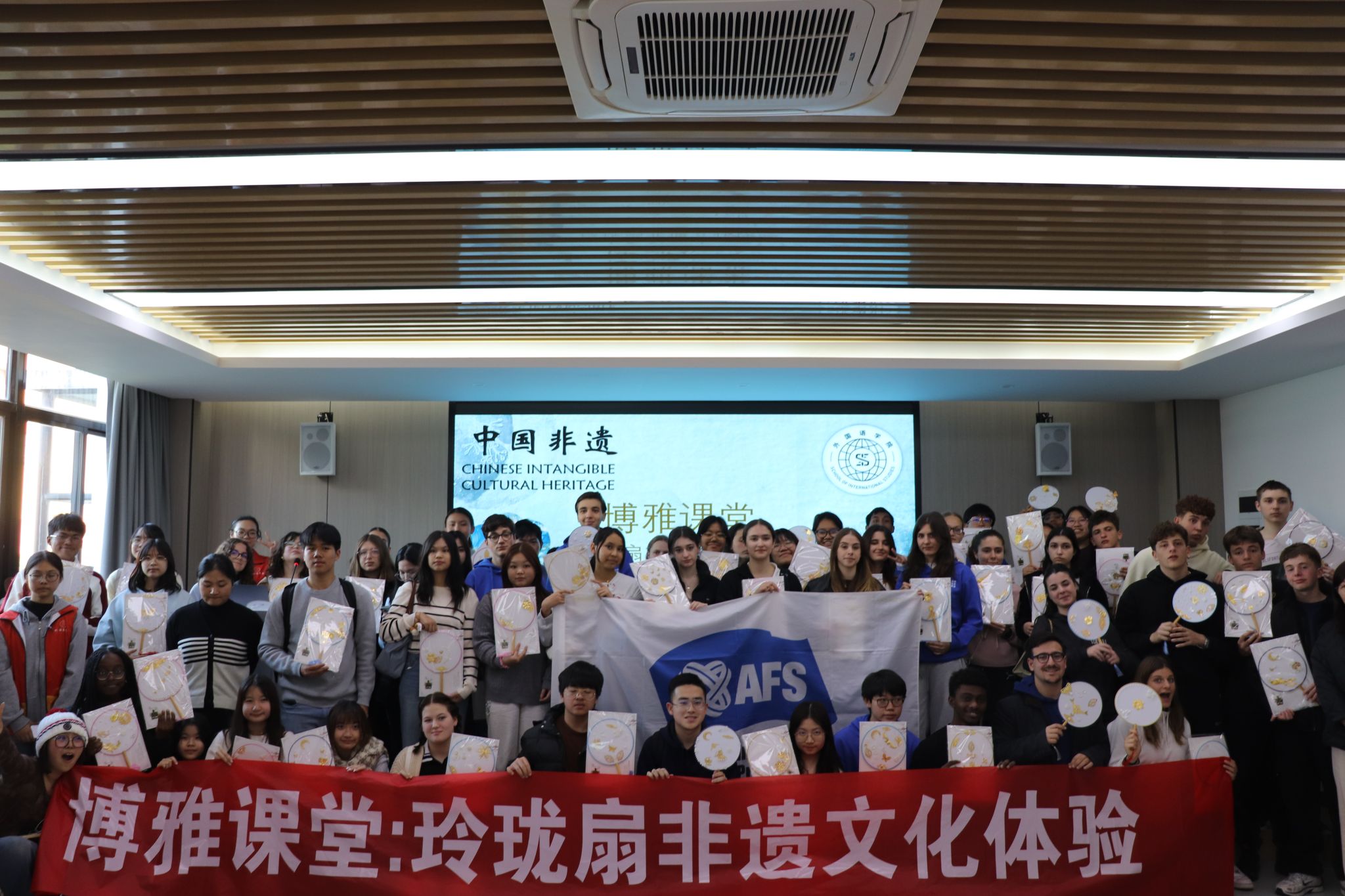 12月2日中午,SC405会议室热闹异常,博雅课堂迎来了67位外籍师生体验玲珑扇非遗制作活动。本次活动由国合处、mk体育联合举办。