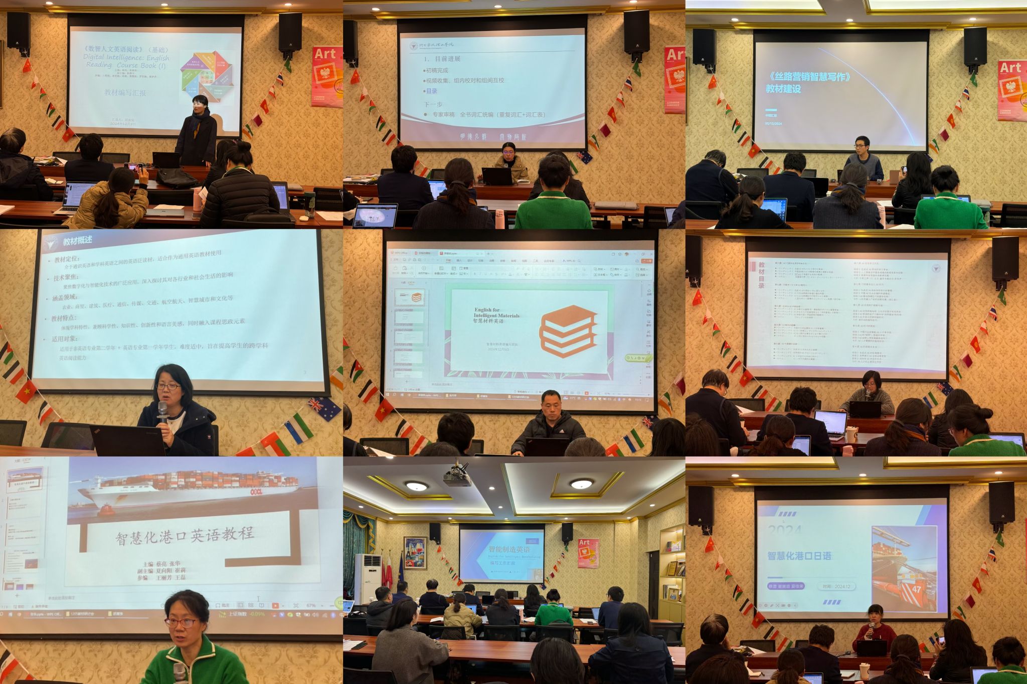 会上,欧教授简要介绍了数智港口外语系列教材的整体情况。随后,张华、廖佳栋、蔡蕾等九位主编分别汇报了《数智人文英语阅读》(基础册和应用册)、《智慧化港口英语》、《人工智能英语》、《智慧材料英语》、《智能制造英语》、《丝路营销智慧写作》、《人工智能日语》、《智慧化港口日语》共九册教材的编写情况,着重展示了教材中的港口元素。