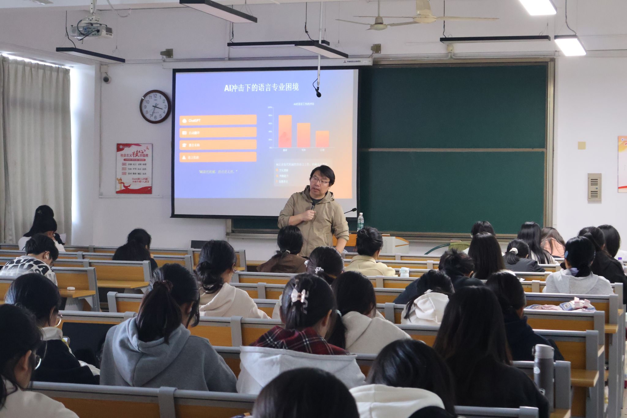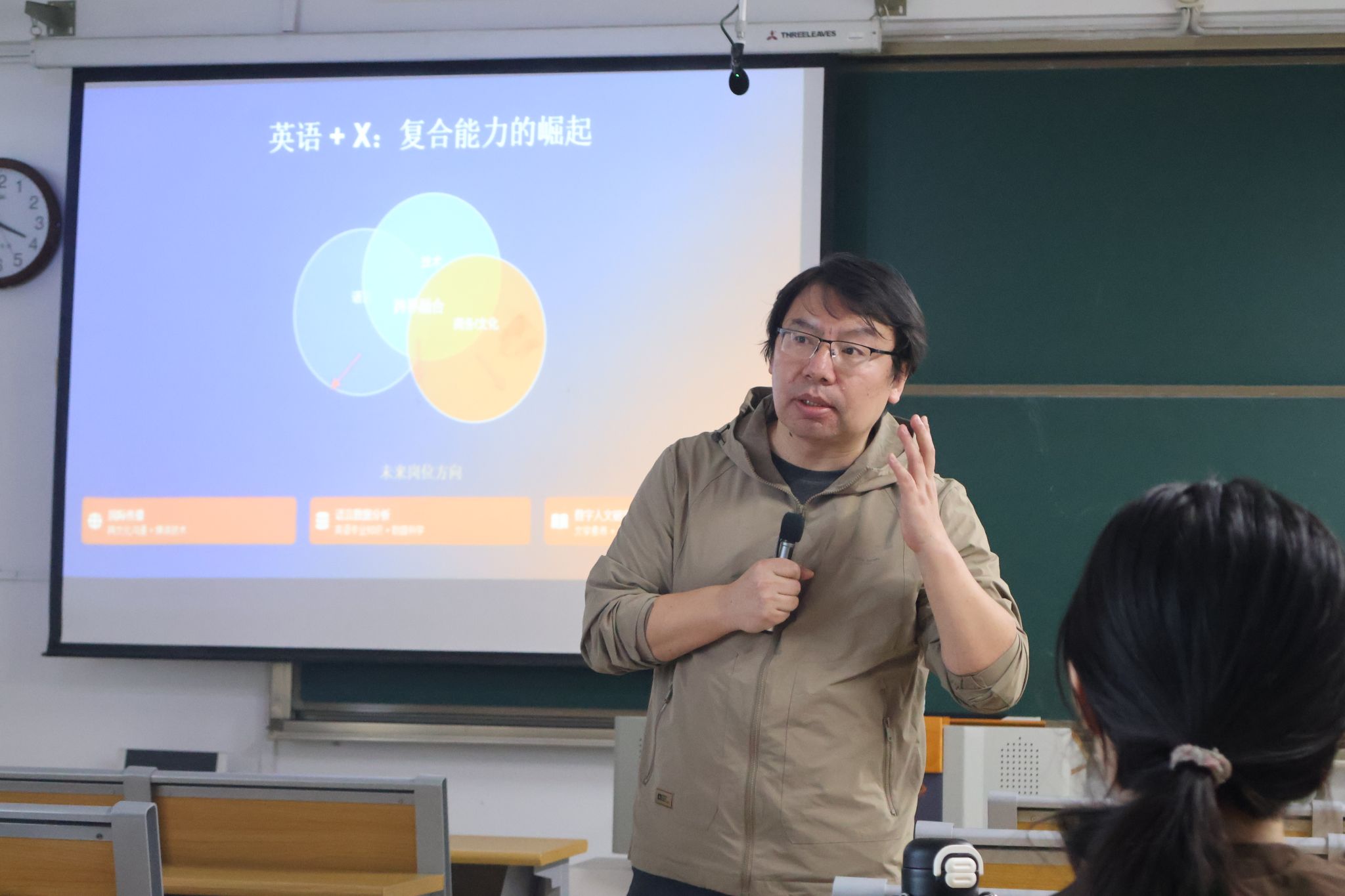 2025年11月13日下午,mk体育“语”你同行,“职”引未来——人工智能时代外语专业员工的职业发展讲座在SB201顺利举办。本次讲座由mk体育英语系副主任李军老师主讲,聚焦人工智能时代外语专业的发展变革,系统解读职业发展路径,为外院学子提供专业且实用的指导。