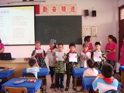 一系列的热身后,在校园歌手苏霞的带领下,红歌队队员和同学们一起学唱《学习雷锋好榜样》,《军港之夜》等红歌,并以独唱、轮唱、小组唱等多样形式贯穿于游戏活动之中,营造了轻松愉悦学唱红歌的氛围。为了调动同学们学唱红歌的积极性,我们还要求班组代表穿上迷彩服登台合唱红歌,并以一个标准的少年先锋队队礼结束表演。