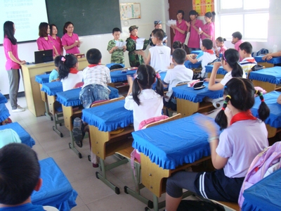 当我们踏入东裕小学四年级二班的时候,少年儿童天真烂漫的情景将队员们深深折服。这是祖国的新一代,看到他们眼中对新事物渴望的这一刻,更加坚定了我们组织好这次教唱红歌活动的决心。考虑到小学四年级的同学还是少年队员,他们对共青团和共产党都还不是很了解。所以在教唱红歌前,我们首先简要地向他们介绍了少年队、共青团与共产党之间关系及其她们各自的性质。在这个过程中,同学们听得非常仔细,并多次和主持人进行了互动。接着是听红歌、猜歌名的游戏,同学们都踊跃参与。当听到一些耳熟能详的红歌,如《让我们荡起双浆》,《我爱北京天安门》时,不少同学都情不自禁、深情并茂地唱了起来。可见,红歌的魅力早已深深地烙在了同学们的心灵中。