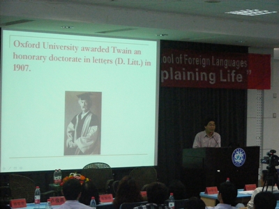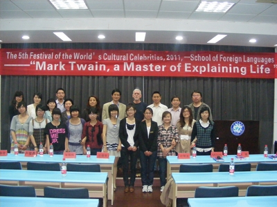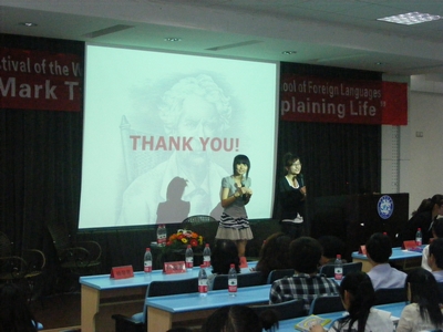 叶琴法副经理在开幕致辞中提到名人周这样的学术活动在培育校园文化、提高同学们人文素养等方面发挥了重要作用,也为广大的师生提供了学以致用的平台和机会。他希望我们能在马克. 吐温的文学作品中,寻找内心的启迪和生命的感怀,从马克吐温的幽默中看人生百态,感知他的生命情怀,共同走进我们心中的马克吐温。