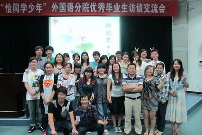 5月26号晚,NF103不时传出热烈的掌声,“恰同学少年”—外国语分院分院优秀毕业生访谈交流会在这里举行。分院英语专业教研室主任张振梅老师,分院团委李炜、陈印昌老师等出席了交流会。访谈邀请了分院2011届优秀毕业生代表与在场的同学们交流自己的老员工活和未来之路。